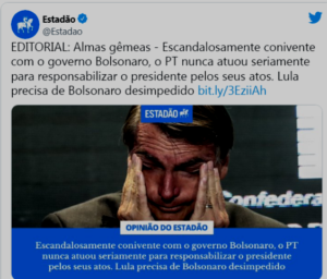 – No próximo editorial, o Estadão provará que o coronavírus não foi criado pela China, mas pelo Lula, num laboratório do MST.