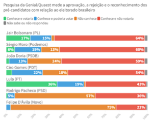 – Não é! A rejeição do MitÔ está em 64%, a de Moro em 61%, a de Dória é 59% e a do Ciro é 51%, enquanto a de Lula atinge 43%. Creio que Merval não considera os desconhecidos Rodrigo Pacheco e Felipe D’Ávila como os principais adversários de Lula, né mesm…?