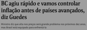 – No Reino da Fantasia, o ex Posto Ipiranga disse que “nosso Banco Central agiu mais rápido e vamos controlar antes do que a maioria dos países avançados.” Disse que ela será um grande problema, mas acha que o Brasil está bem equipado para enfrentá-la mais rapidamente.