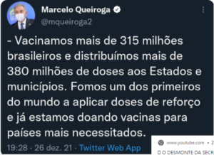 – O cardiologista Queiroga nunca aprendeu isto! 315 milhões de brasileiros vacinados? Nem se contássemos os fugidos pros Estados Unidos e Portugal e as crianças de 5 a 11 anos que, aliás, ele não quer vacinar… apesar de ser médico!