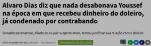 – O objetivo era outro! Prender Lula e destruir o PT pra assumir o poder. Álvaro Dias diz que o doleiro Youssef, que deflagrou a Lava Jato, ainda era santo e íntegro quando ele recebeu dinheiro dele pra sua campanha. Youssef, então, já era contrabandista e até fora preso… – Preso, aliás, pelo Moro. Mas isto não são coisas que se comenta entre amigos!