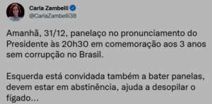 – As redes repercutiram intensamente e os bolsonaristas se apavoraram… Um ‘jênio’ propôs fazer um panelaço de apoio. O MitÔ convocou, então, um panelaço… e La Zambelita disseminou pelas redes. Os panelaços se confundirão mas, lembrem-se, não existe panelaço A FAVOR!