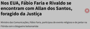 – Eu disse e repito: ele está foragido! A PF não consegue encontra-lo, mas o ex jogador Rivaldo e o ministro da Comunicação, Fábio Faria, sim! Eles estavam juntos num evento religioso em Orlando, na Flórida. Rezando pra Deus, quem sabe?, mantê-lo escondido de autoridades brasileiras.