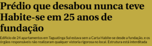 9 – A história se repete neste Brasil de tantas putarias: um prédio de 24 apartamentos em Taguatinga, Brasília, desabou parcialmente… e, totalmente habitado, não tinha Habite-se! Com 25 anos de construído, o prédio nunca foi sequer visitado por um fiscal…