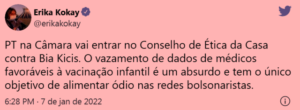 8 – A verdade é que o decoro parlamentar foi jogado no lixo. Bia Kicis, presidente da Comissão de Constituição e Justiça, vaza dados dos médicos que participaram da Audiência Pública sobre vacinação das crianças, desobedecendo o § X do Art 5º da Constituição, que diz: